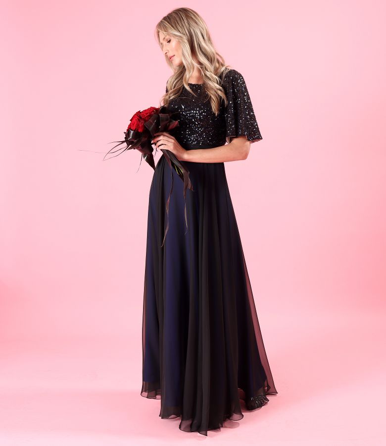 Rochie lunga de ocazie din voal cu bust si maneci din paiete
