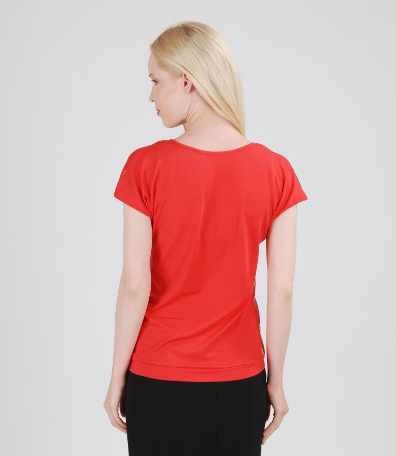 Bluza din jerse elastic, cu fata de saten elastic imprimat si garnitura la terminatie. Pozitia imprimeului poate varia per produs.