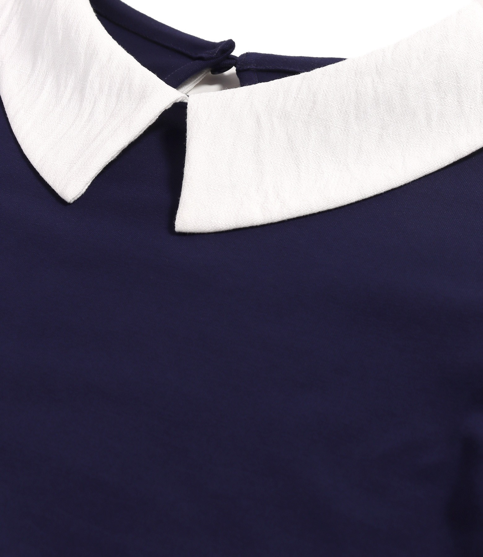 Bluza din jerse elastic fin de viscoza, cu maneci 3/4 si guler ascutit alb. Se inchide cu un nasture pe spate.
