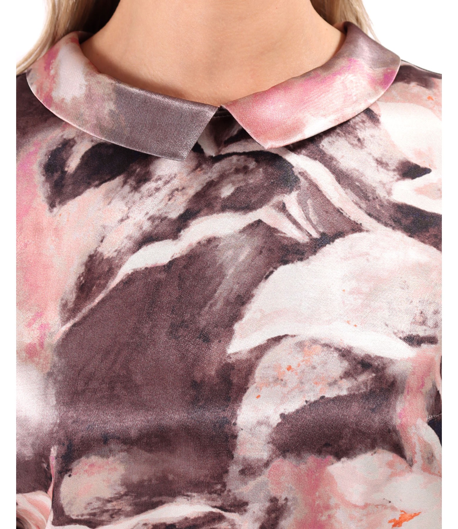 Bluza din viscoza satinata imprimata cu motive florale, cu maneci scurte si guler ascutit. Se inchide cu nasture pe spate.