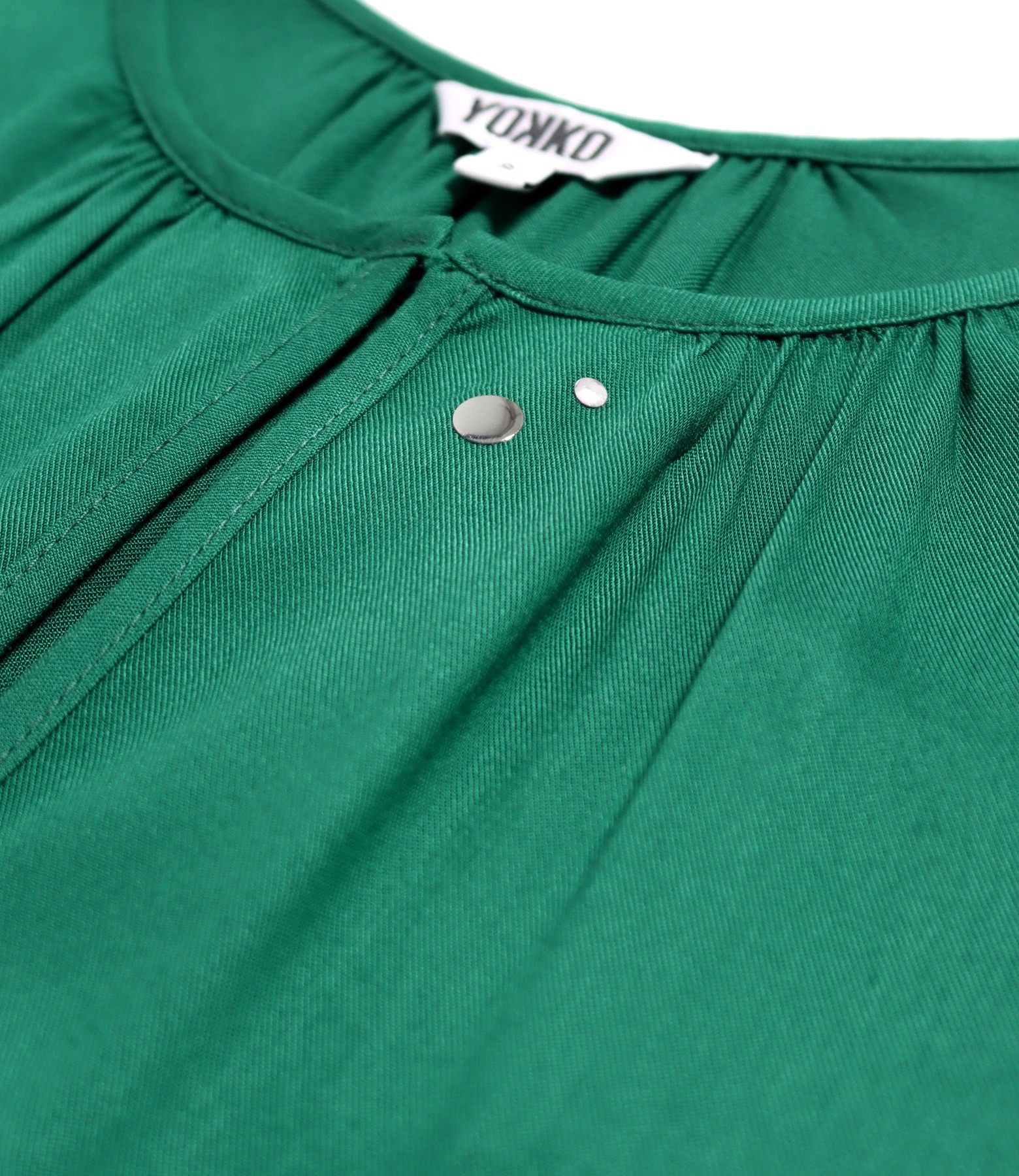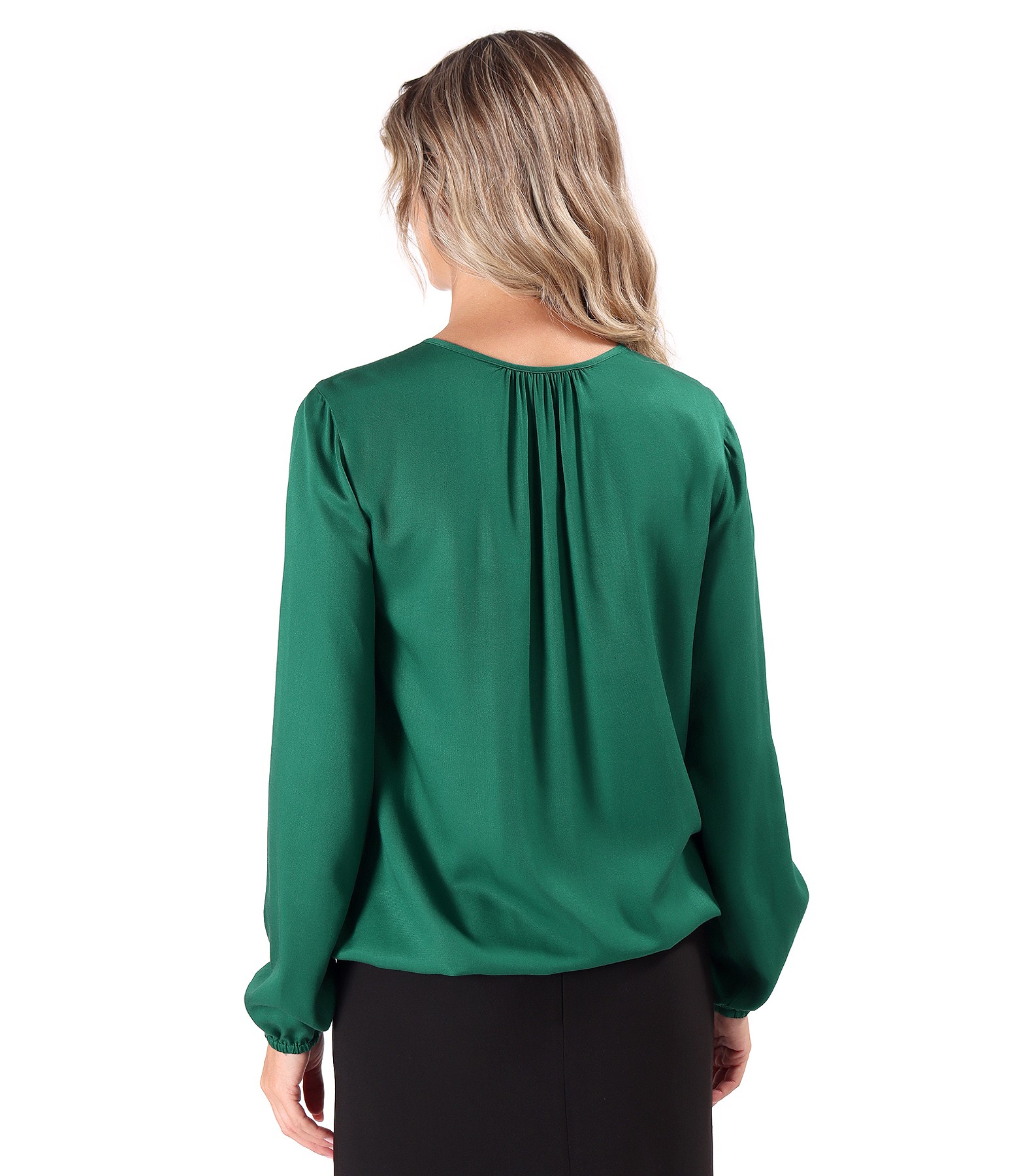 Bluza eleganta din viscoza satinata, cu maneci lungi cu elastic, terminatie elastica si decolteu rotund cu V inchis pe fata cu o capsa mos-baba si aplicatie de cristale.