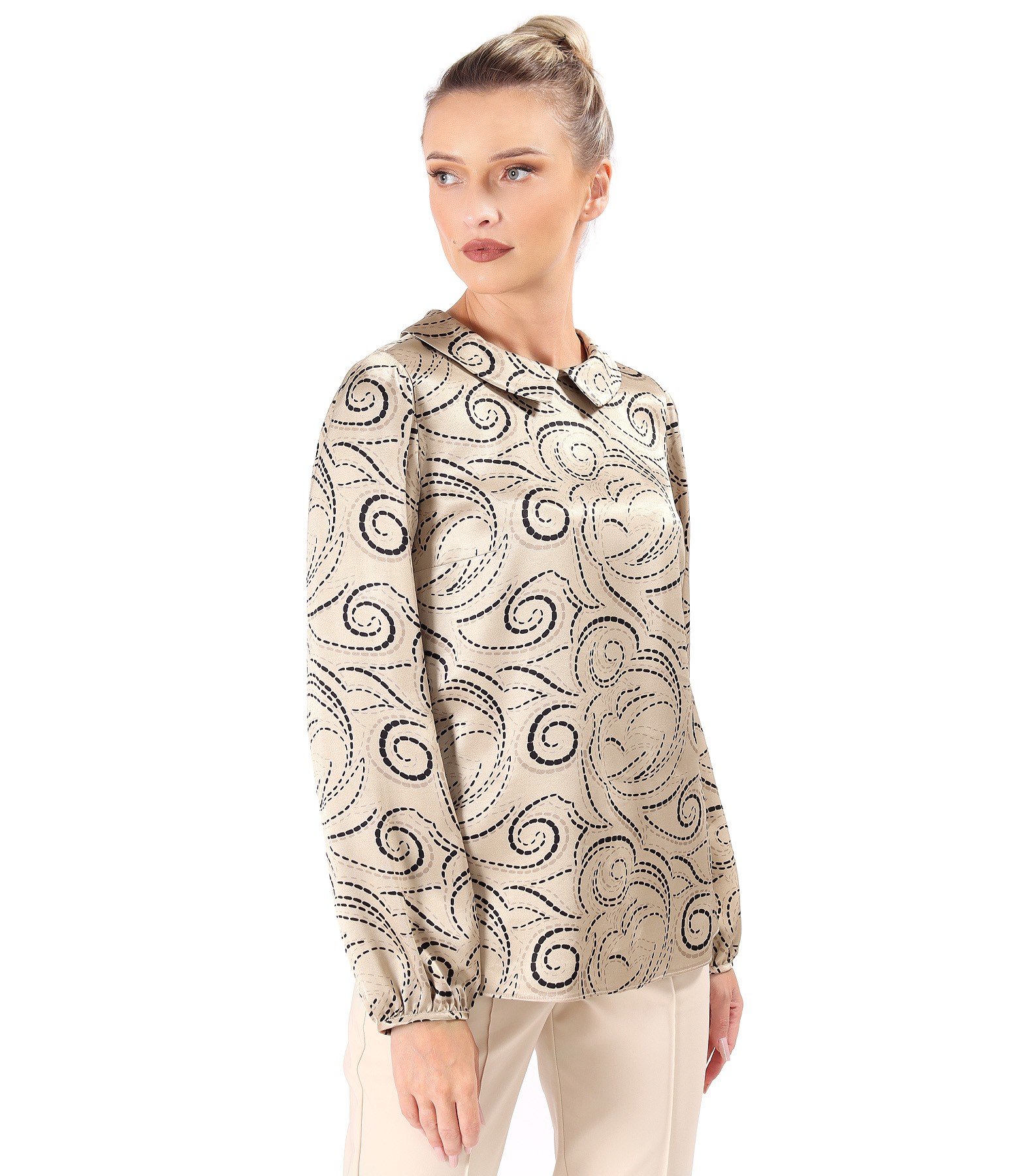 Bluza eleganta din viscoza satinata imprimata, maneci lungi incretite la terminatie si guler ascutit. Se inchide cu nasture pe spate.