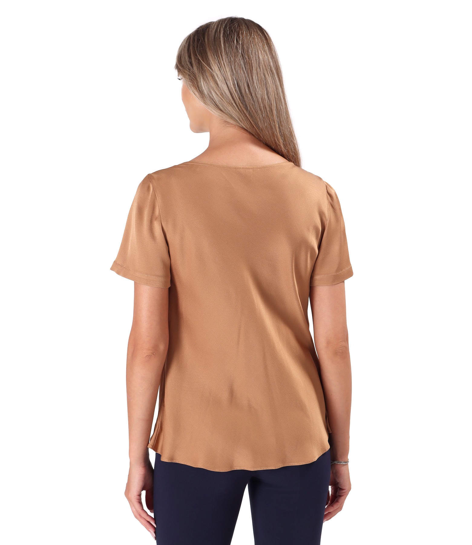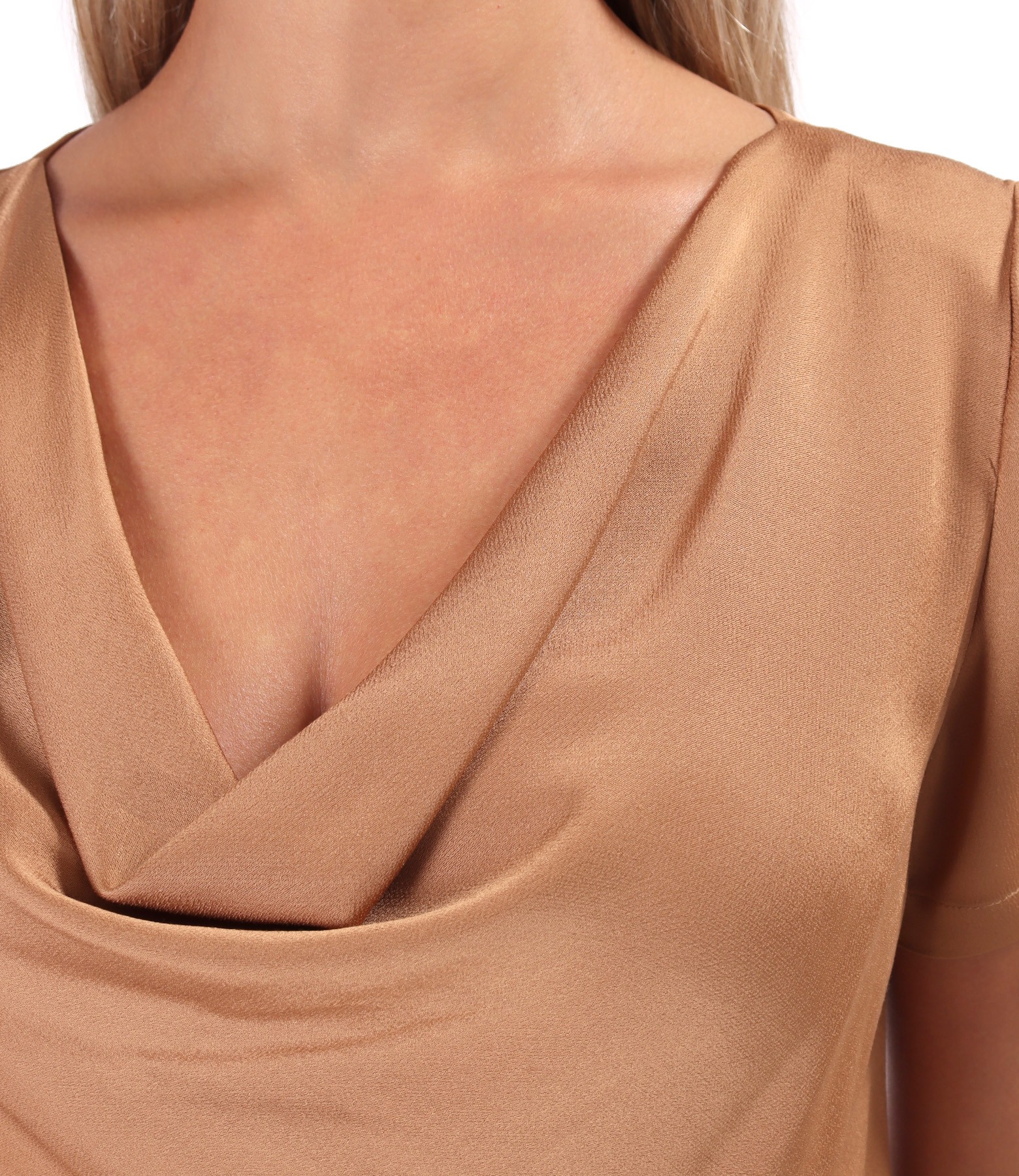 Bluza eleganta din saten de viscoza, pe bie, cu falduri la decolteu si cu maneci scurte.