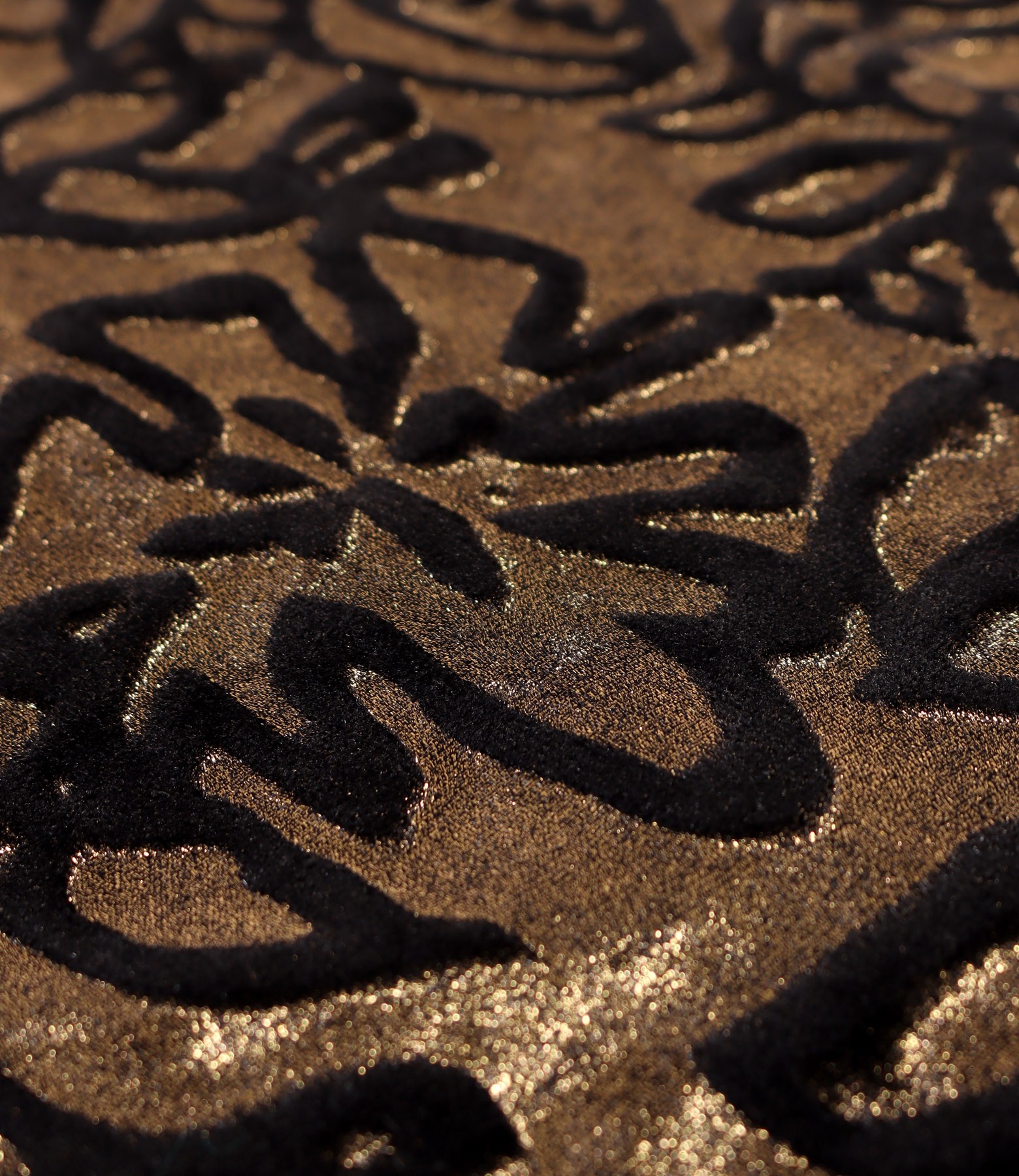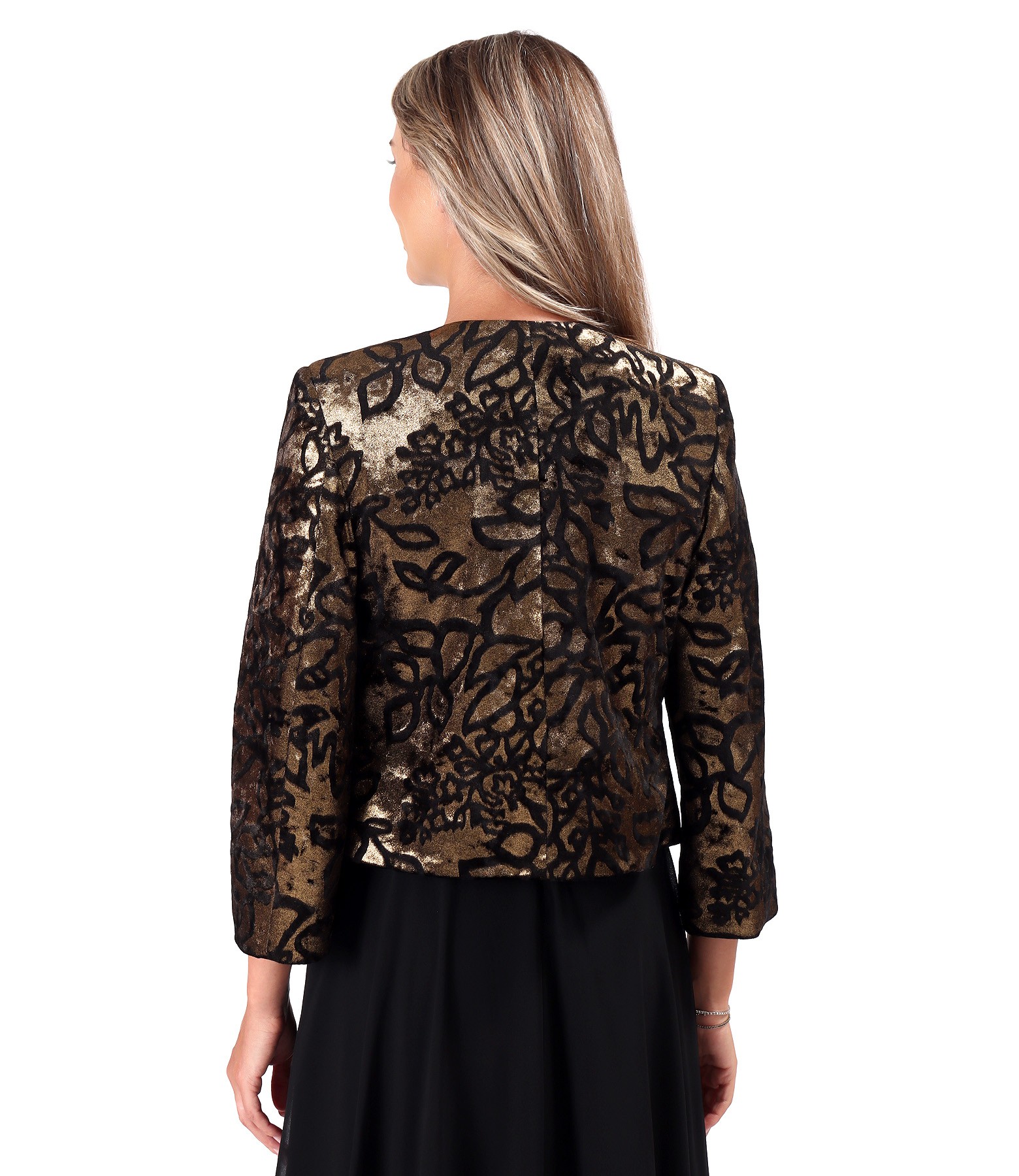 Bolero din catifea elastica imprimata cu motive aurii, captusit si cu maneci 3/4. Se inchide cu 2 capse mos-baba in partea superioara.