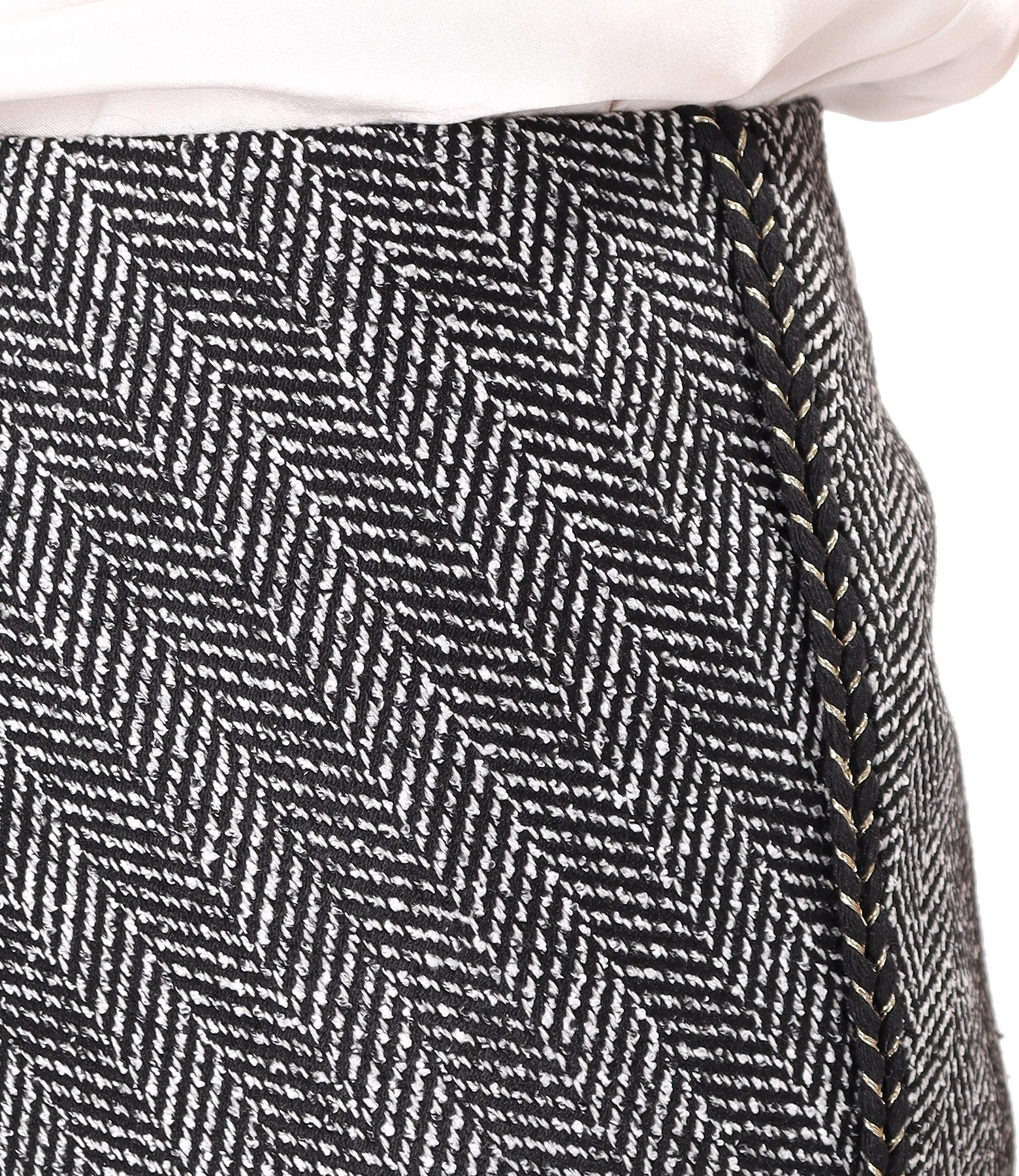 Fusta evazata pe bie, in 4 clini, din bucle cu bumbac si cu banda decorativa negru cu auriu pe lateral. Se inchide cu fermoar ascuns pe mijloc spate.