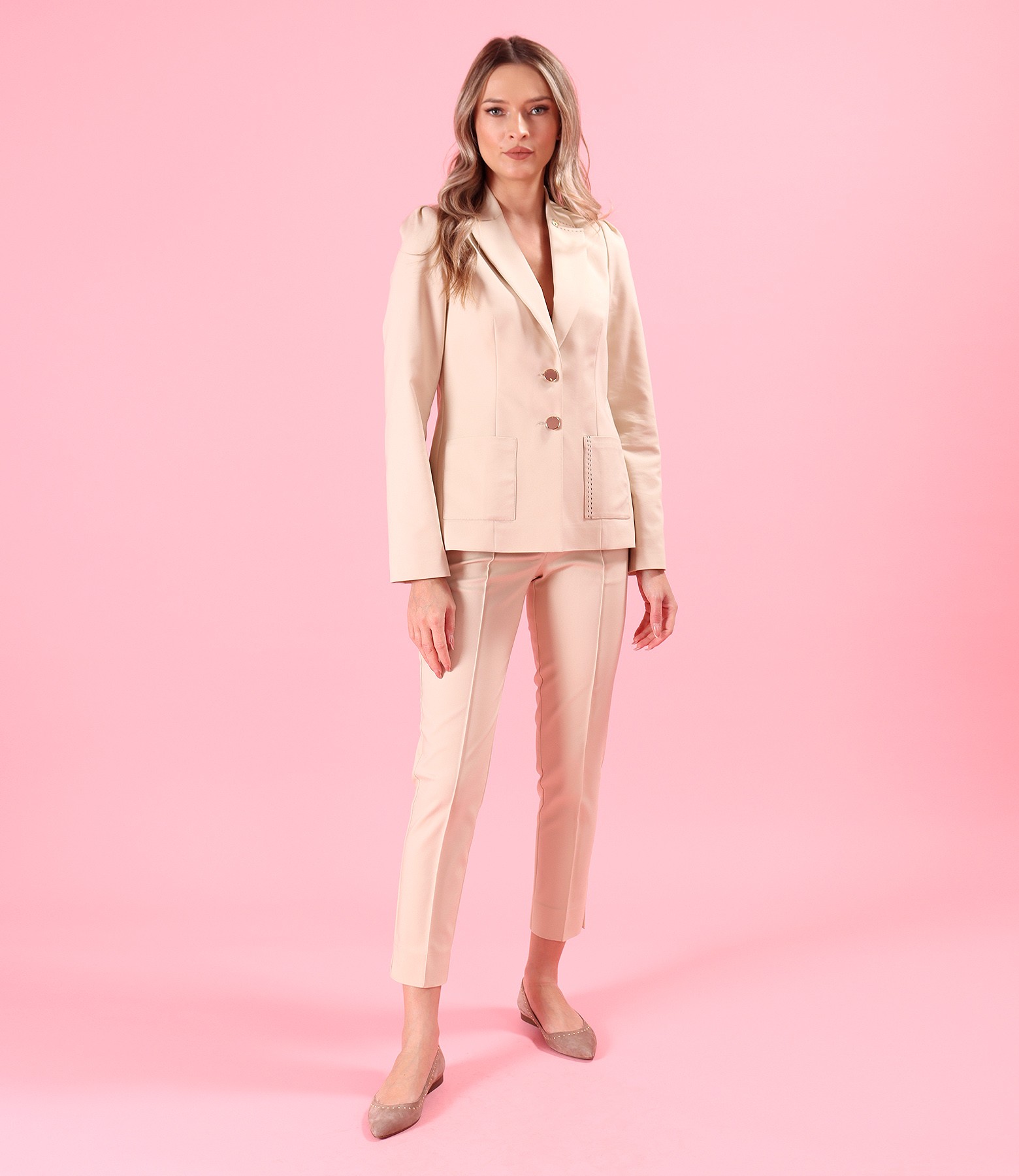 Pantaloni din bumbac elastic cu aspect catifelat, cu buzunare pe fata, cu banda elastica si cusatura decorativa in talie si dunga cusuta pe mijloc fata. Se inchid cu fermoar normal, contra-nasture si 2 capse mos-baba pe fata. Au slit pe glezna.