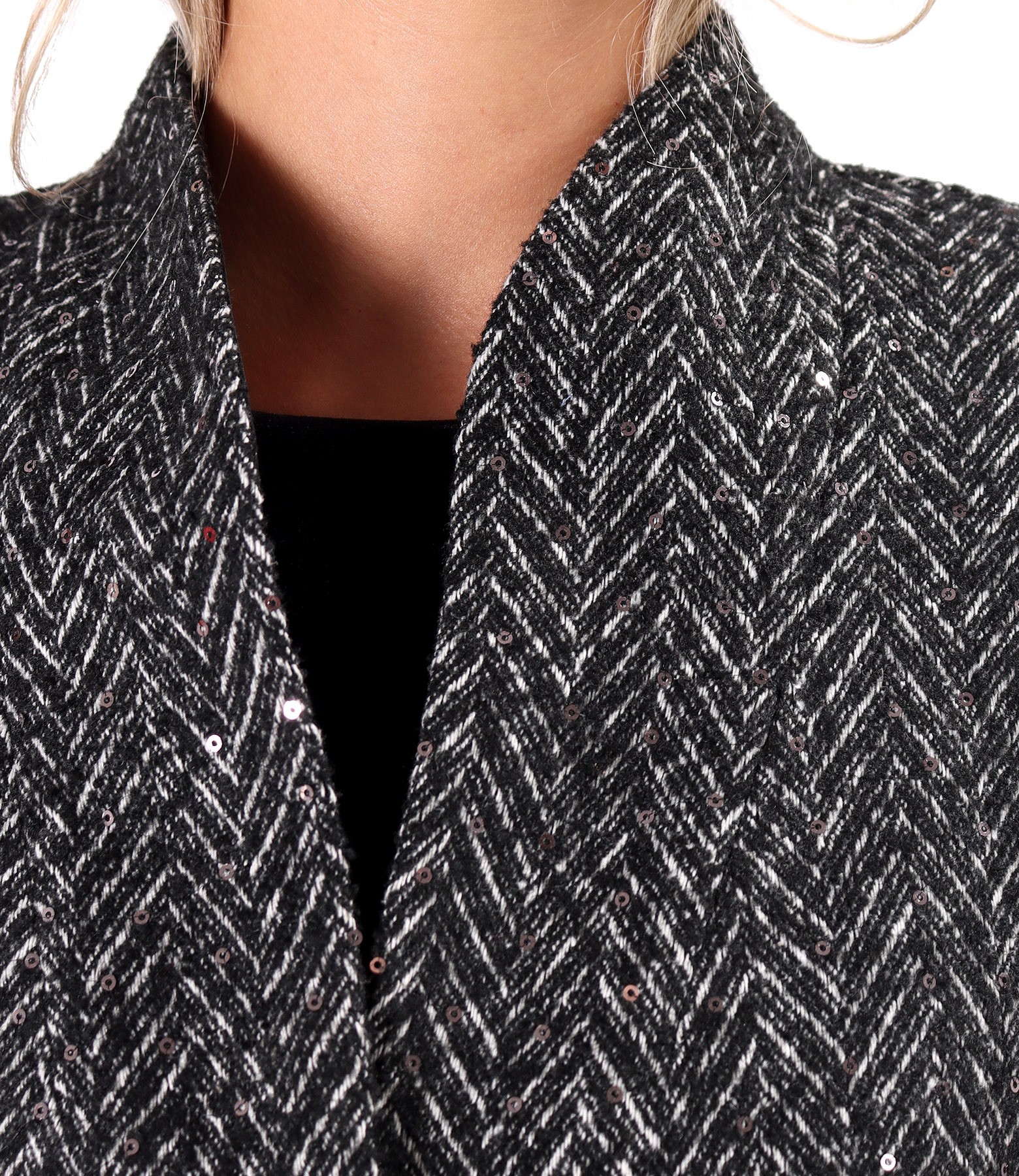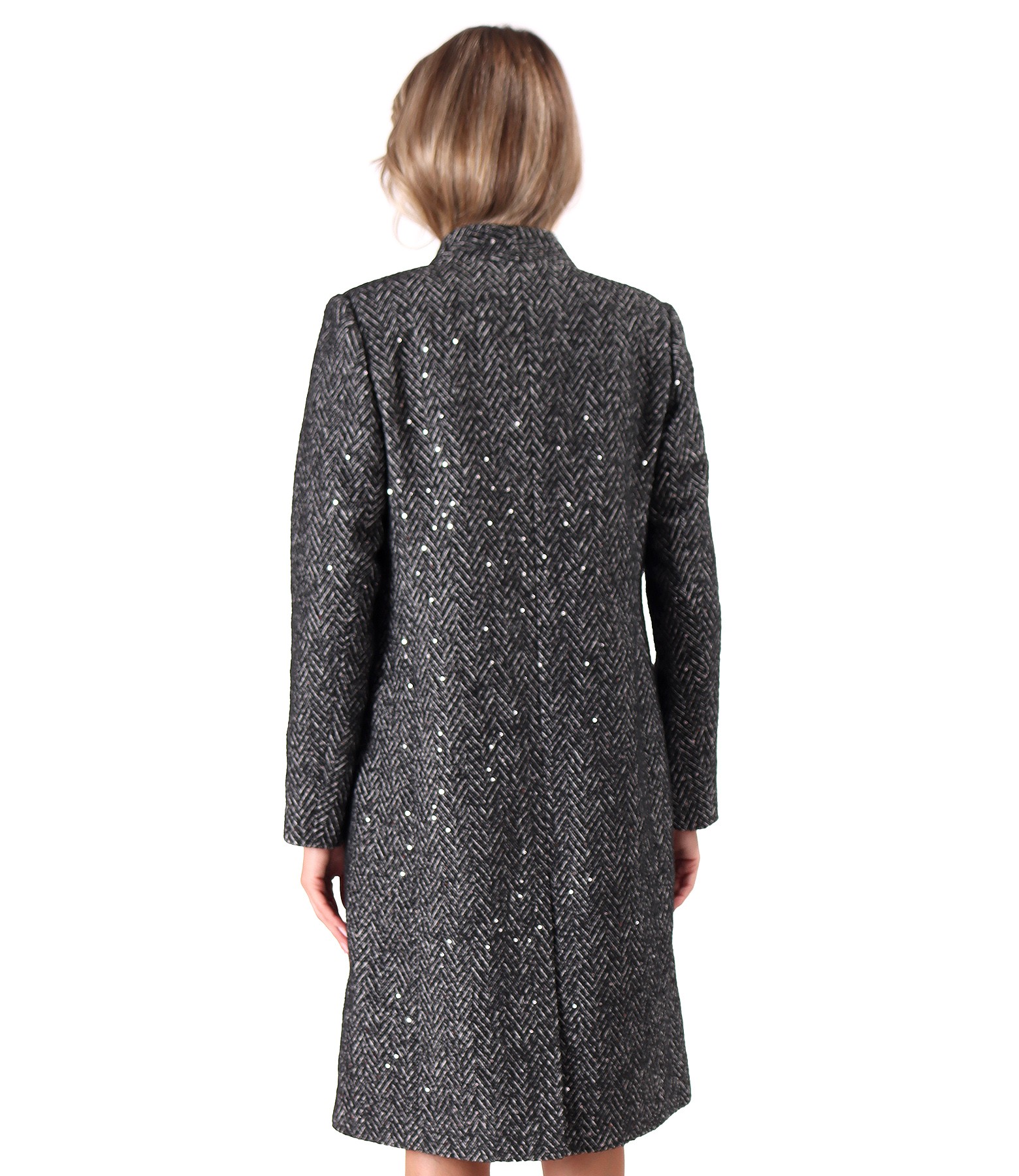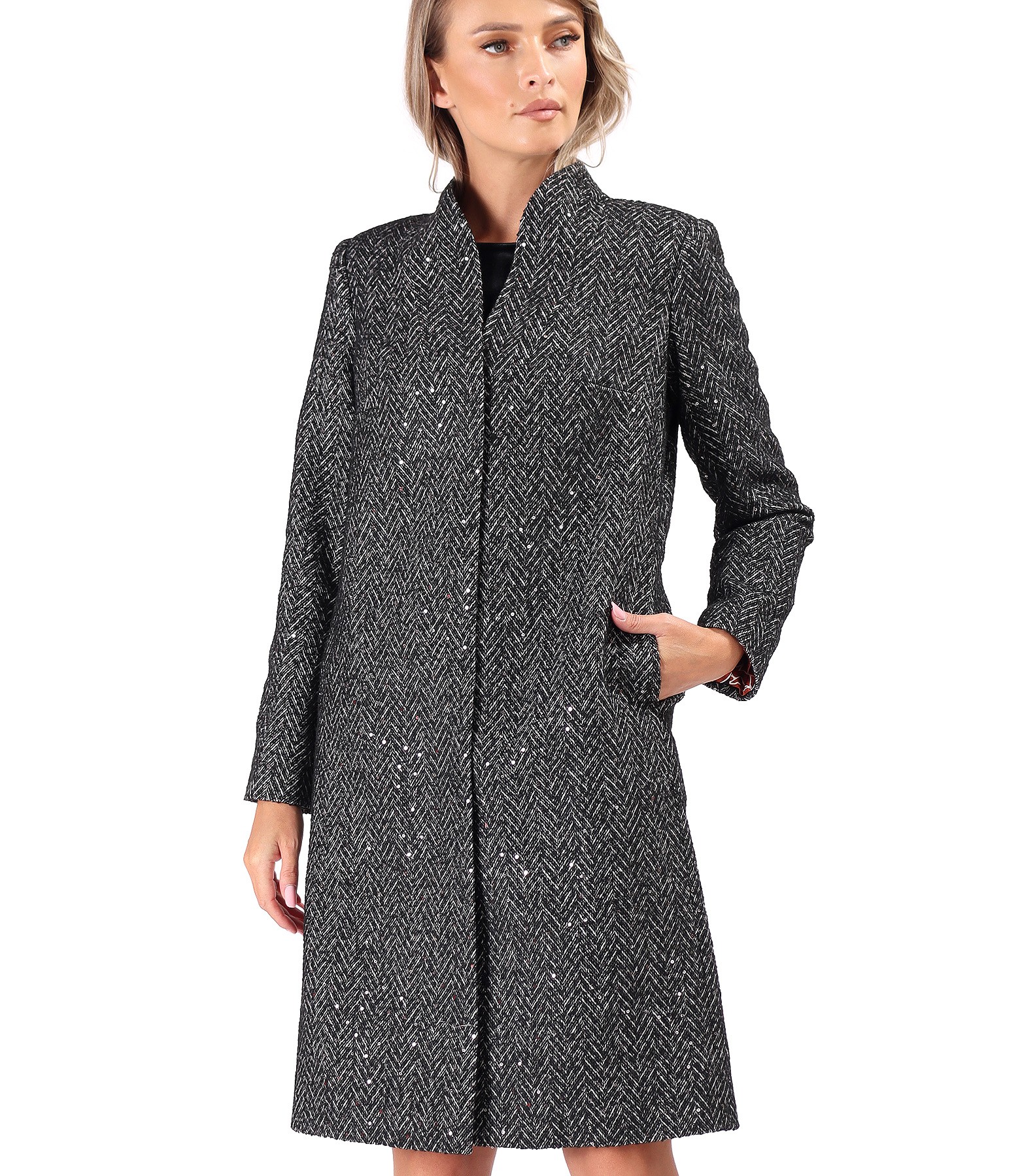 Pardesiu elegant din stofa cu paiete, cu guler gen tunica, buzunare laterale si slit pe spate. Se inchide pe fata cu 4 capse metalice.
