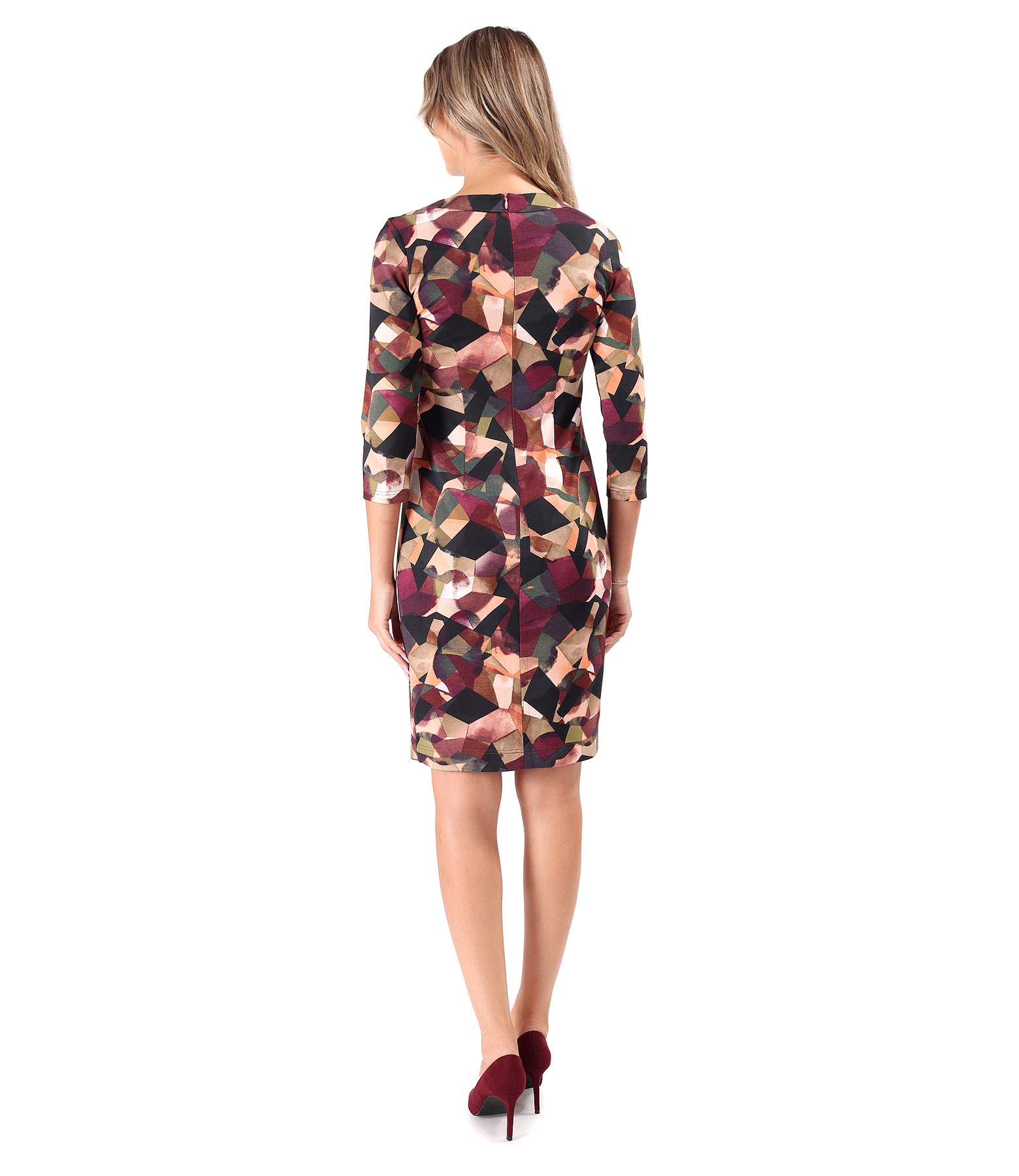 Rochie din jerse elastic gros imprimat cu motive geometrice, cu decolteu in V, necaptusita, si cu maneci 3/4. Se inchide cu fermoar ascuns pe mijloc spate.