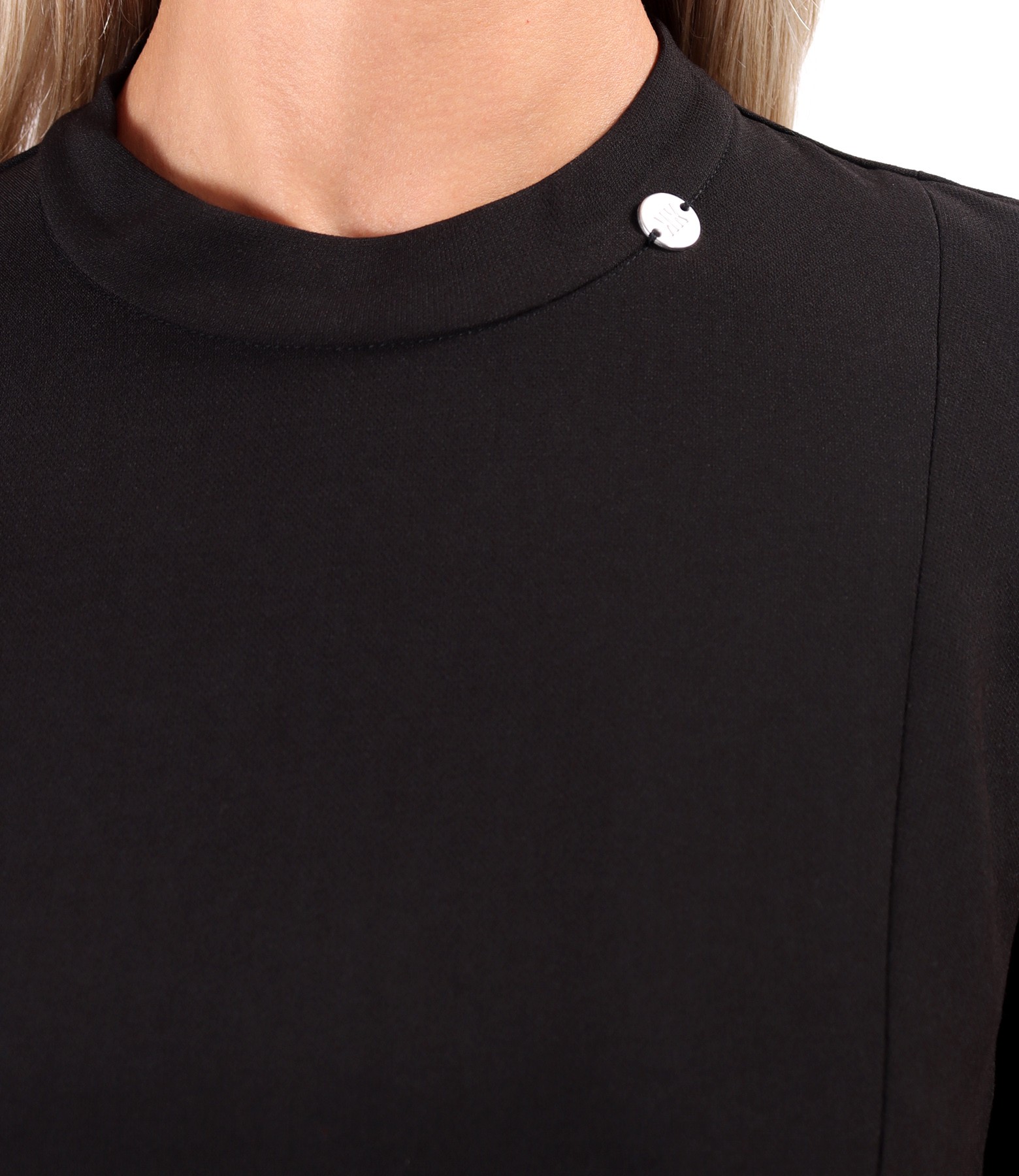 Rochie eleganta din stofa elastica cu viscoza, cu maneci lungi evazate si guler rotund. Se inchide cu fermoar ascuns pe mijloc spate.