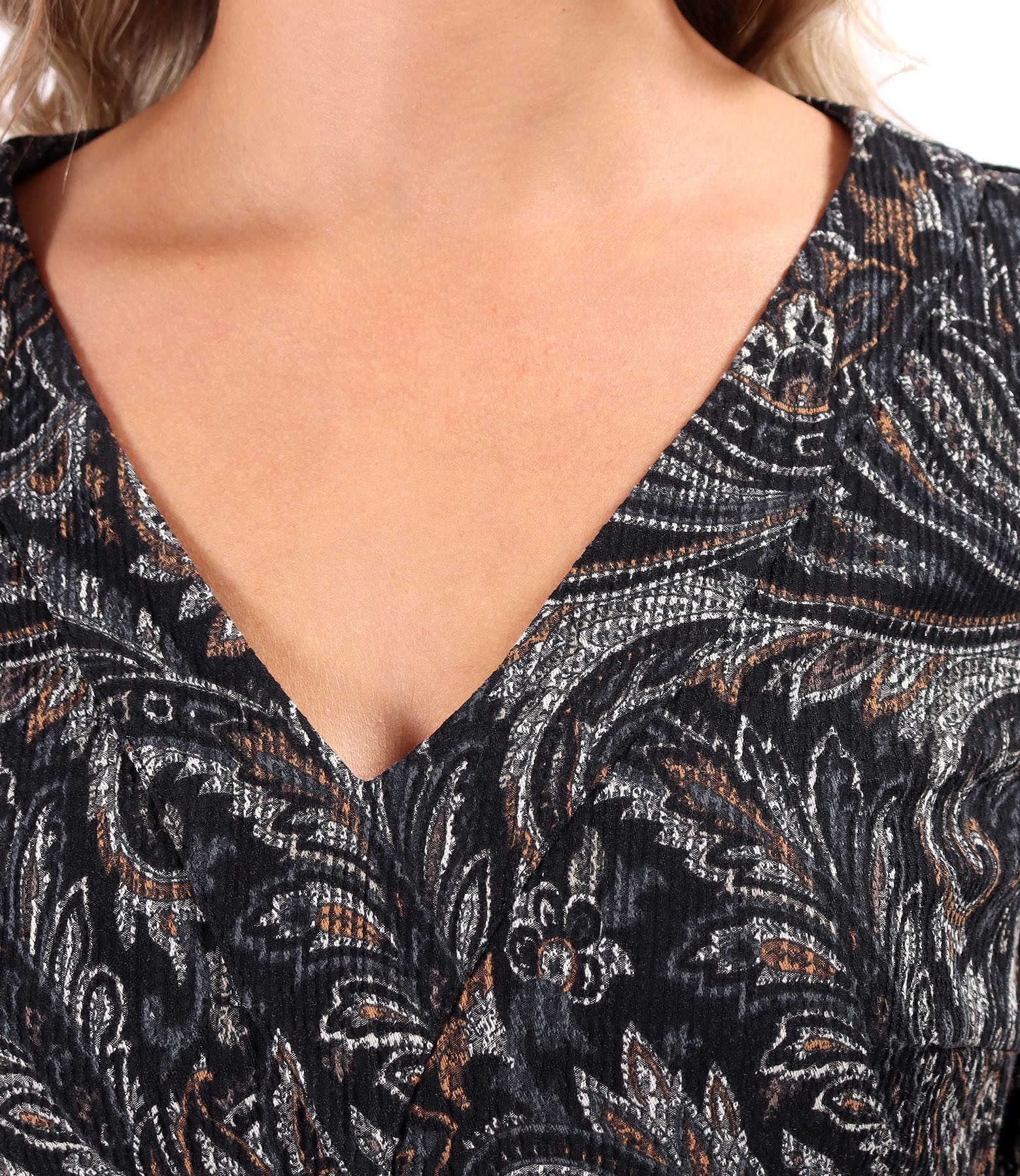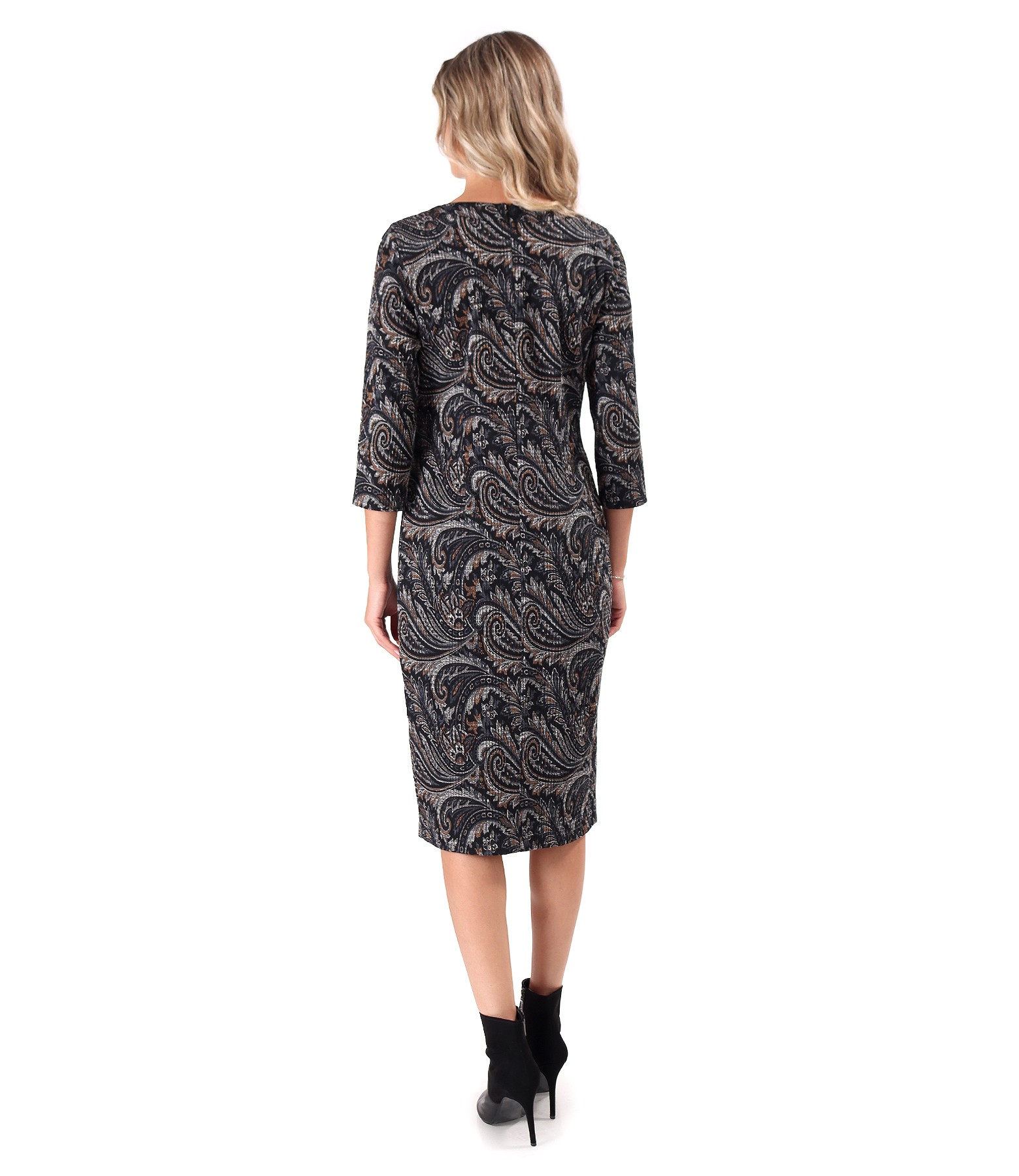 Rochie eleganta din brocart elastic cu striatii in relief si motive paisley, necaptusita, cu maneci 3/4, decolteu in V, buzunare laterale cu banda decorativa si lant argintiu. Se inchide cu fermoar ascuns pe mijloc spate.