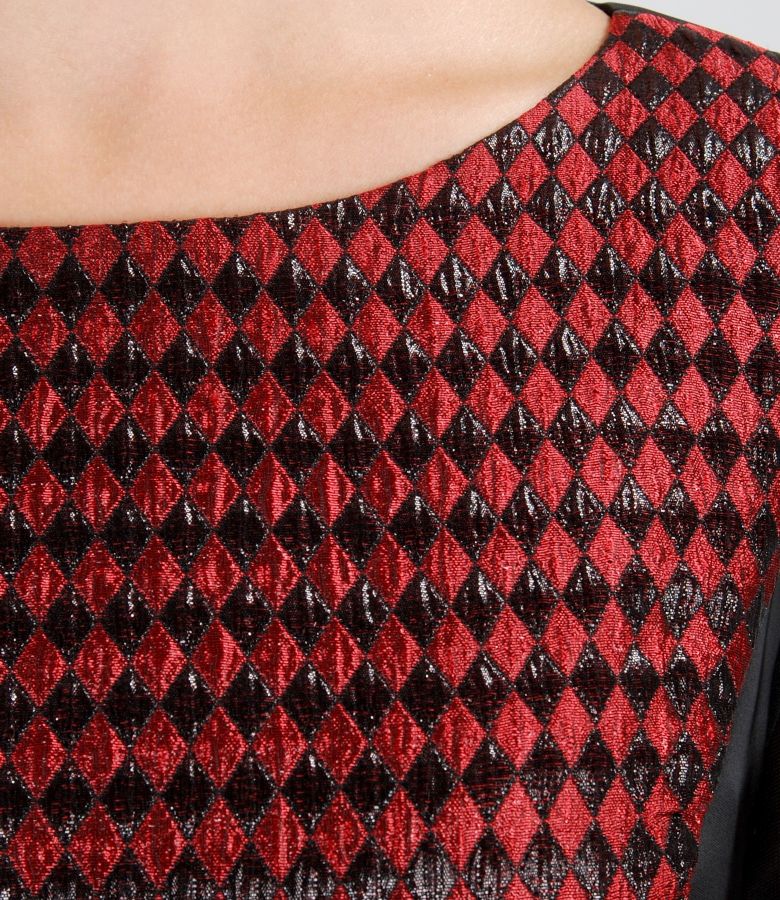 Rochie eleganta din brocart in carouri grena-negru lucios, cu decolteu rotund, spate din saten elastic si maneci din tul moale, elastic. Se inchide cu fermoar ascuns pe mijloc spate.