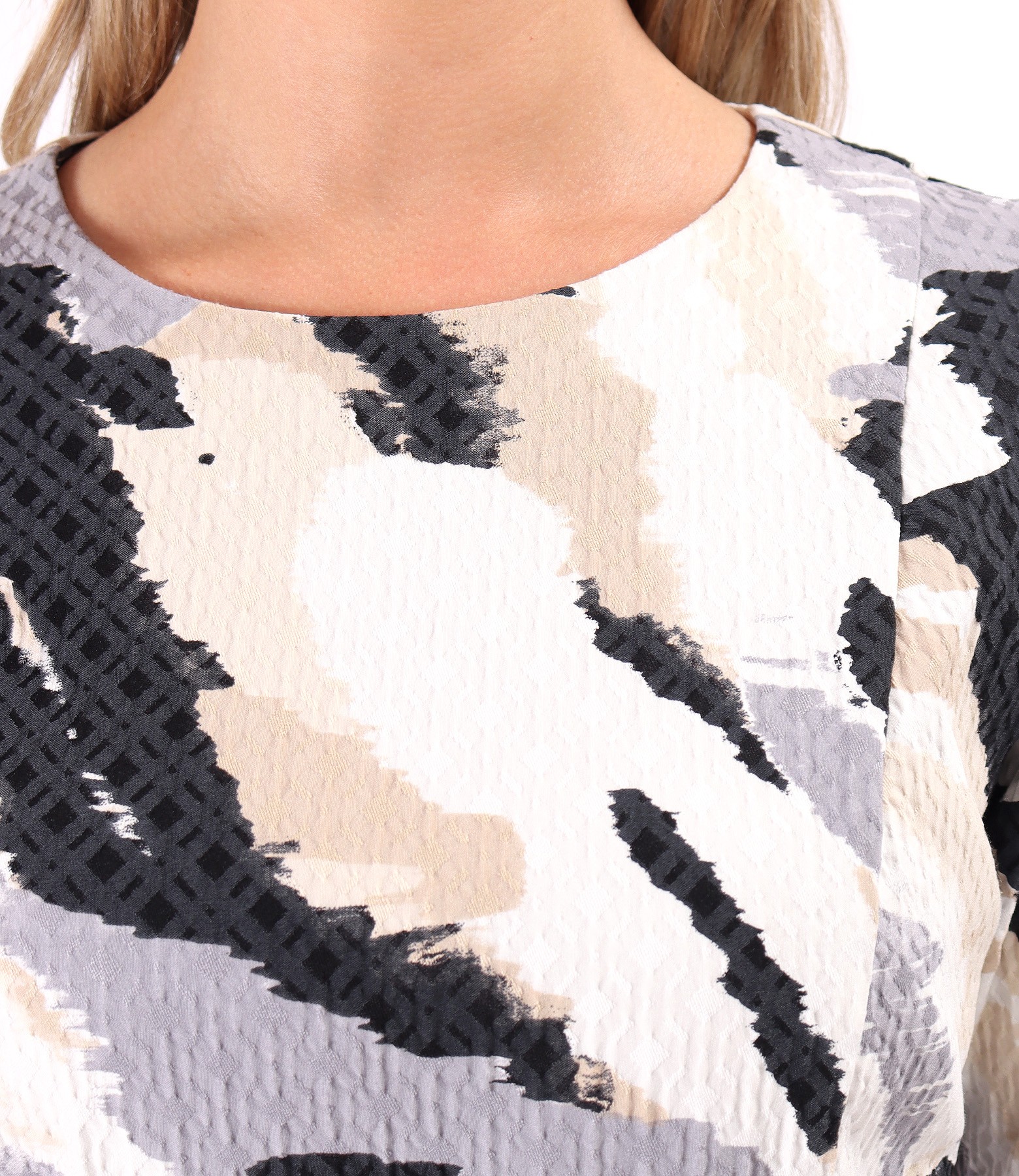 Rochie evazata din brocart elastic imprimat, cu decolteu rotund si maneci scurte. Se inchide cu fermoar ascuns pe mijloc spate.