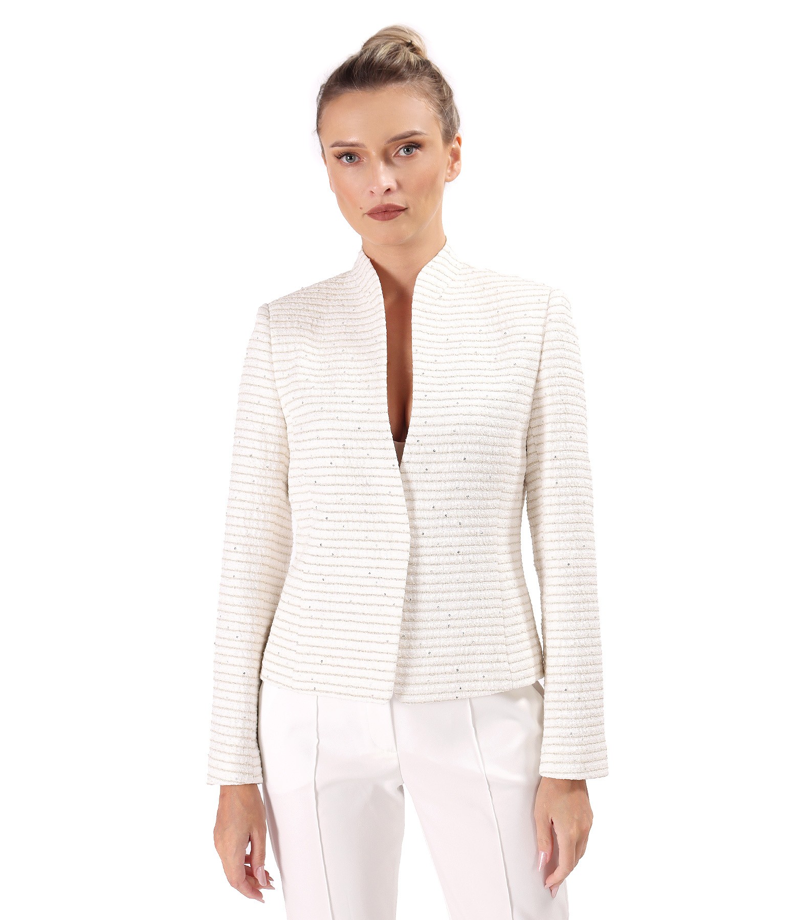Sacou din bucle cu fir metalic auriu, captusit, cu guler gen tunica. Se inchide cu o capsa mos-baba pe fata.