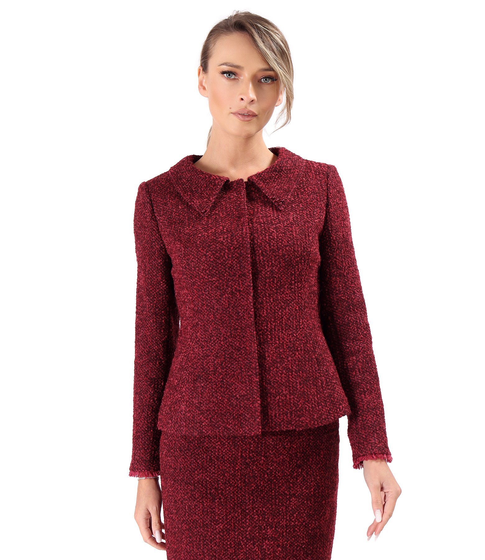 Sacou office din bucle cu lana si alpaca, captusit, cu guler ascutit si cu perle decorative cusute pe gulere. Sacoul are franjuri la terminatia manecilor. Se inchide cu 5 capse pe fata.
