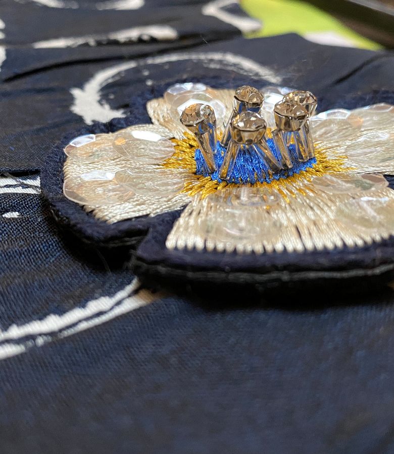 Sacou elegant, captusit, din bumbac elastic gofrat, fara guler, cu maneci 3/4 si brosa detasabila. Se inchide cu 4 capse mos-baba pe fata, pana la nivelul bustului. Nu necesita calcare.