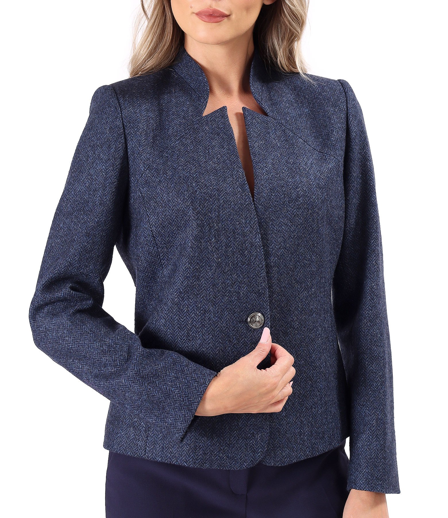 Sacou office din stofa cu lana, dublat cu viscoza, cu guler gen tunica. Se inchide cu un nasture pe mijloc fata.