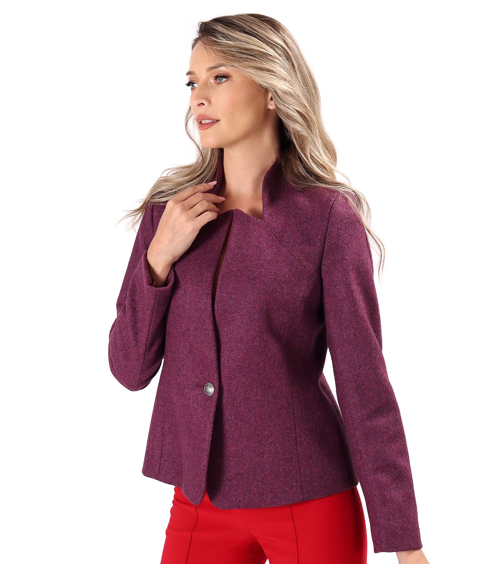 Sacou office din stofa cu lana, dublat cu viscoza, cu guler gen tunica. Se inchide cu un nasture pe mijloc fata.