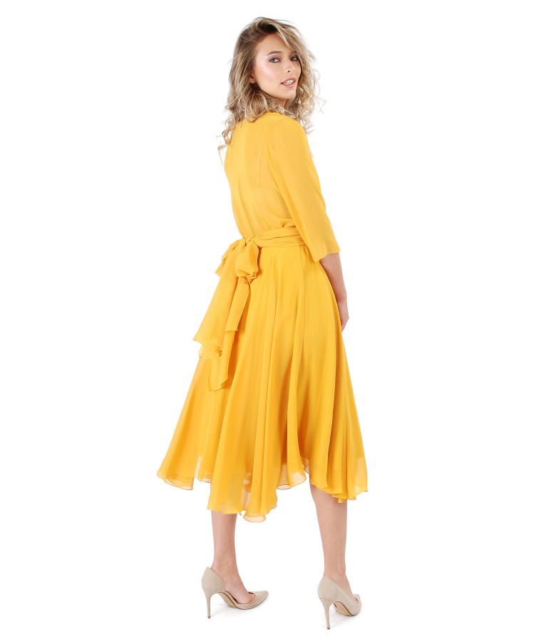 Rochie de seara din voal, captusita cu viscoza, cu maneci 3/4, pieptii petrecuti si cordon in talie.