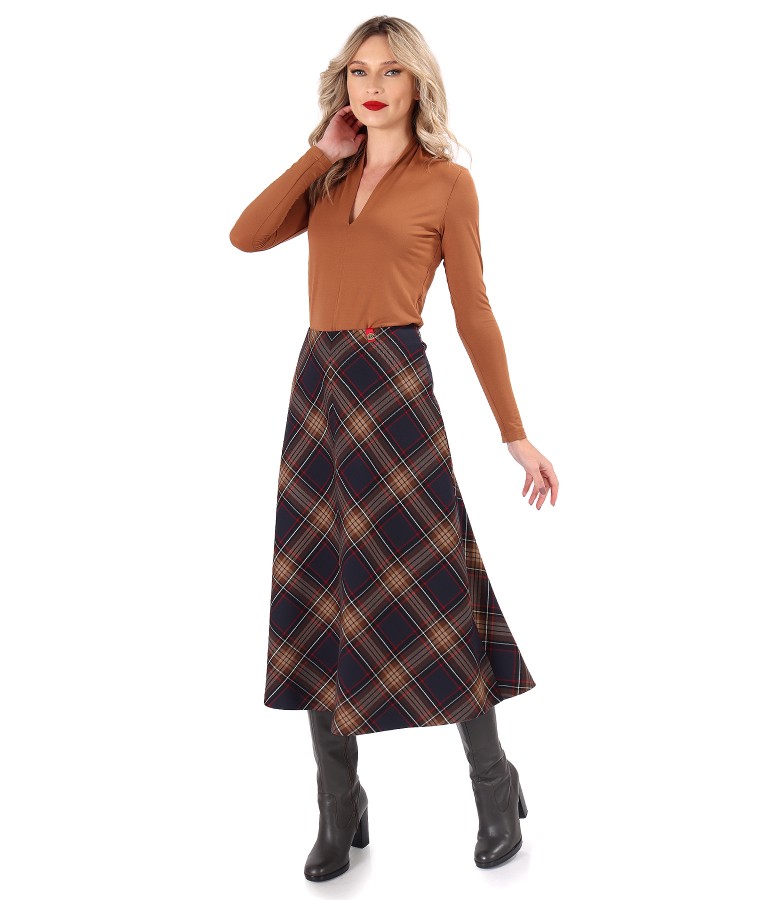 Fusta midi evazata din stofa elastica cu viscoza in carouri.